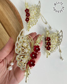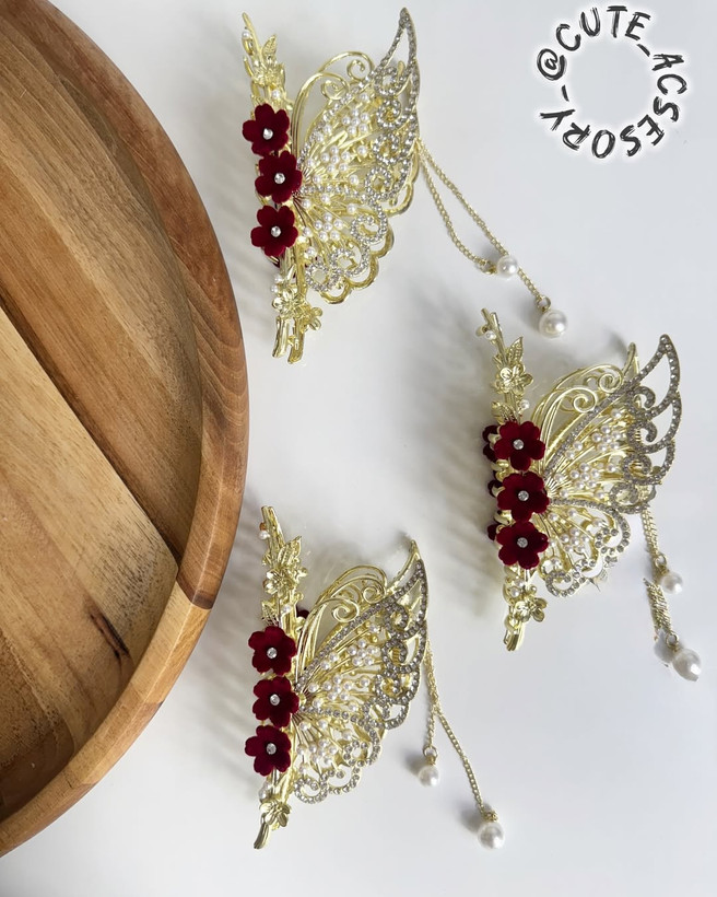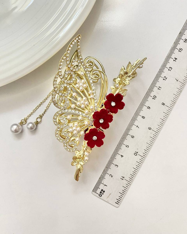 کلیپس مجلسی مدل شکوفه قرمز و نگین کار شده کیفیت درجه یک و ضمانتی ماندگاری رنگ بالا اویزدار جنس فلزی سایز تقریبی ۱۲سانت