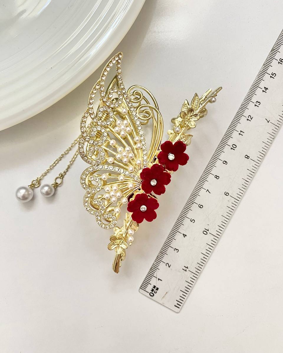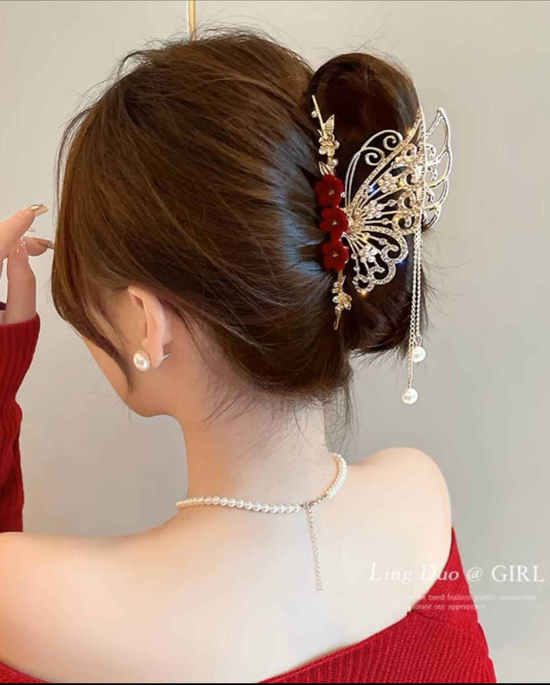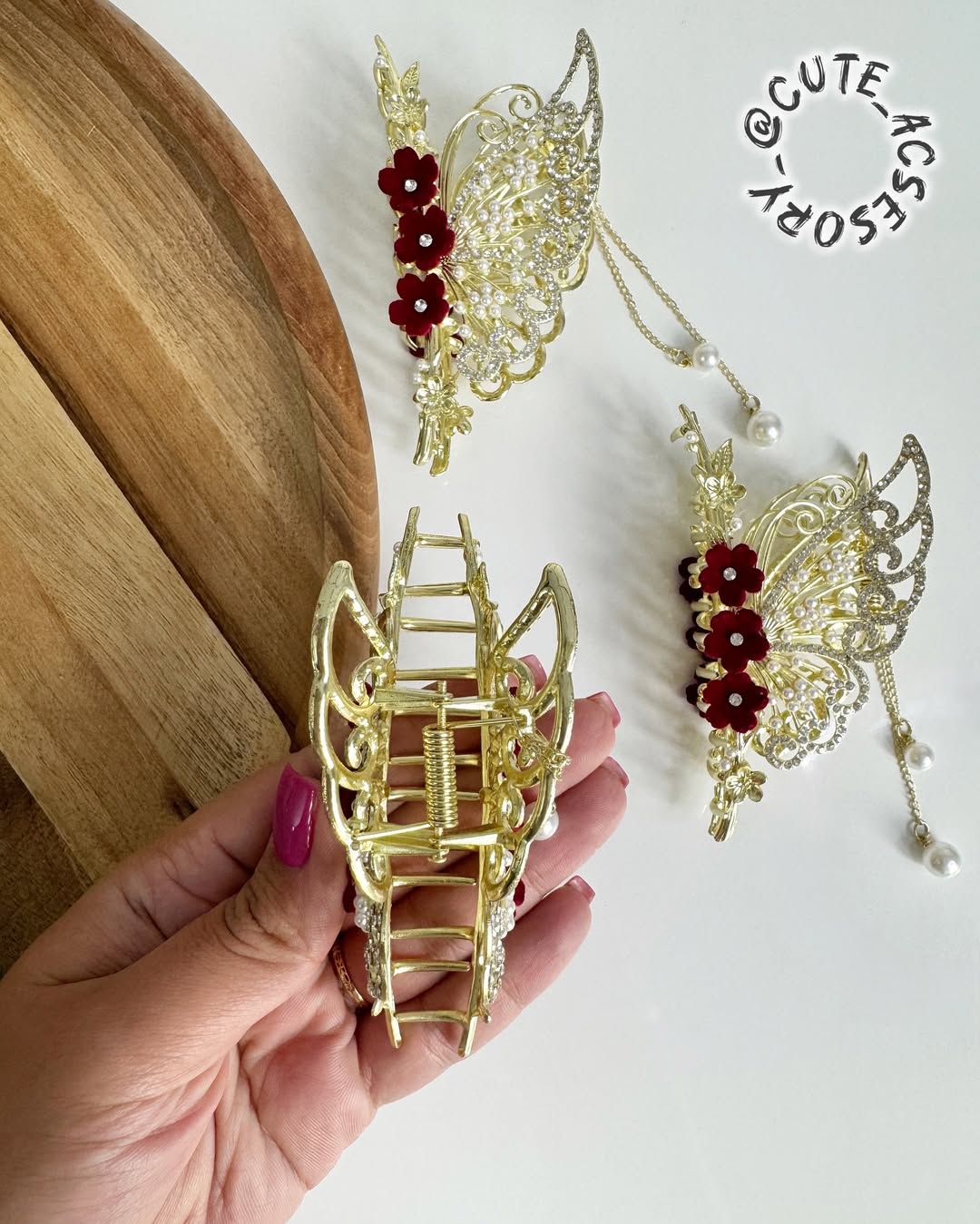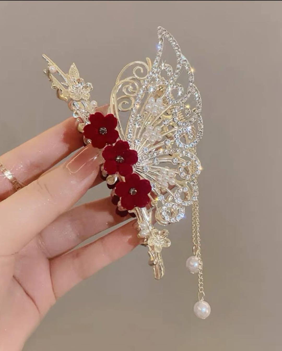 کلیپس مجلسی مدل شکوفه قرمز و نگین کار شده کیفیت درجه یک و ضمانتی ماندگاری رنگ بالا اویزدار جنس فلزی سایز تقریبی ۱۲سانت